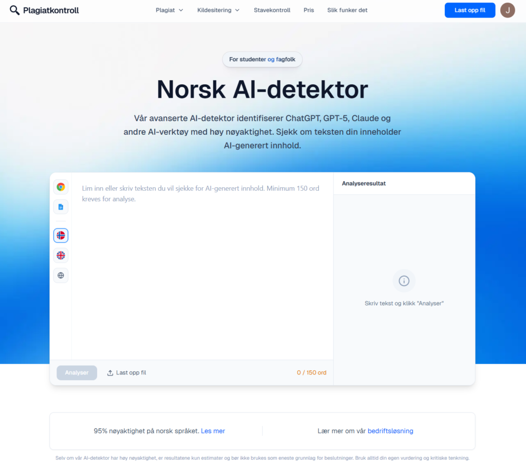 1Plagiatkontroll.no9,5Sterk profil for norsk; egen norskmodell og oppgitt ~95 % nøyaktighet. God helhet når du vil kombinere plagiat og AI-sjekk i samme økosystem.